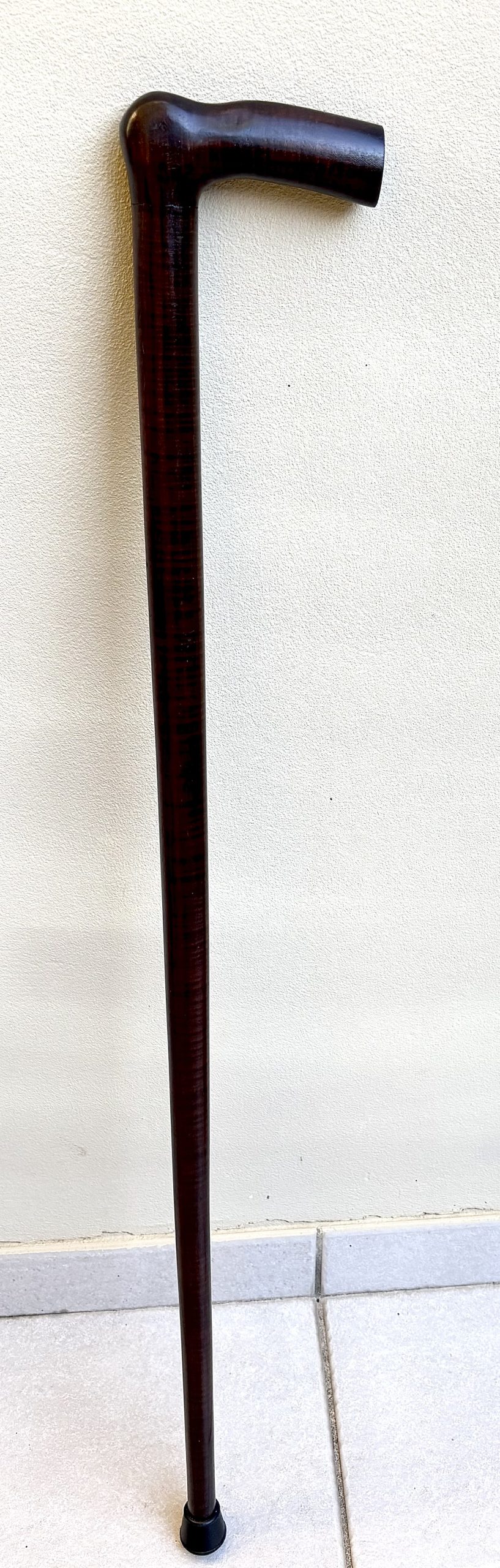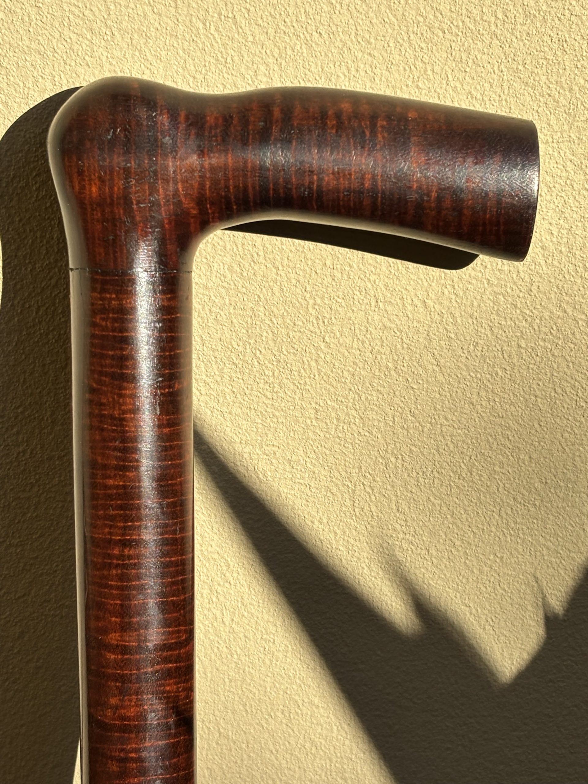 This is a heavy (625 grams) ringed gidgee walking stick from around 1900-1920 with the L or “opera” style handle. It looks almost black, but has the most beautiful chatoyancy closer up, as you can see when it catches the light. They were sometimes made as gifts to high-ranking officials, but this example was for pure domestic use, having no silver/gold finials/knob, etc. I had read that they were brittle due to the curling, but I don’t believe that is true, especially in a stouter stick like this.